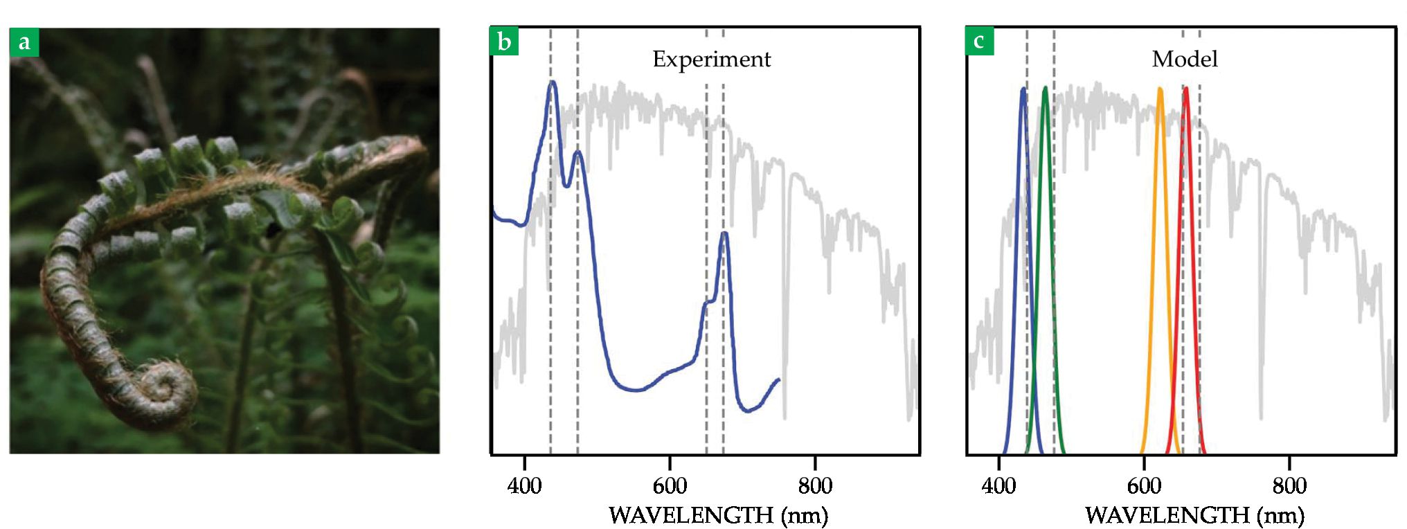 A fern sunbathes (a). Its experimentally observed absorption spectrum (b) is shown in gray, superimposed with peaks (blue) that mark the wavelengths at which chlorophyll pairs in terrestrial plants absorb light. Against the same solar power spectrum (gray), dashed lines mark the spectral frequencies to which the plants’ antenna complexes are tuned. (c) Colored lines represent our model’s predicted peaks. They closely match the frequencies at which plants absorb light. (Adapted from T. B. Arp et al., Science 368, 1490, 2020, doi:10.1126/science.aba6630
