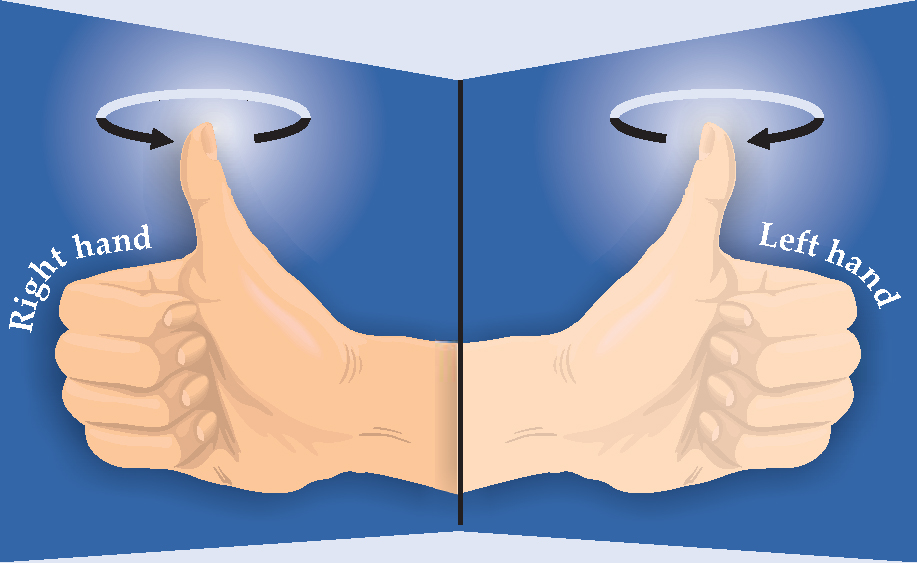 Figure 1. Helicity and handedness. In the standard model, the momentum and spin of a neutrino are antiparallel; the neutrino is said to have negative helicity. The figure shows why SM neutrinos are also sometimes called left-handed. Imagine that the thumb of the left hand points in the direction of momentum and the fingers curl in the direction of a spinning particle. The spin and momentum vectors will be antiparallel. For the right hand, spin and momentum are parallel; corresponding particles have positive helicity.