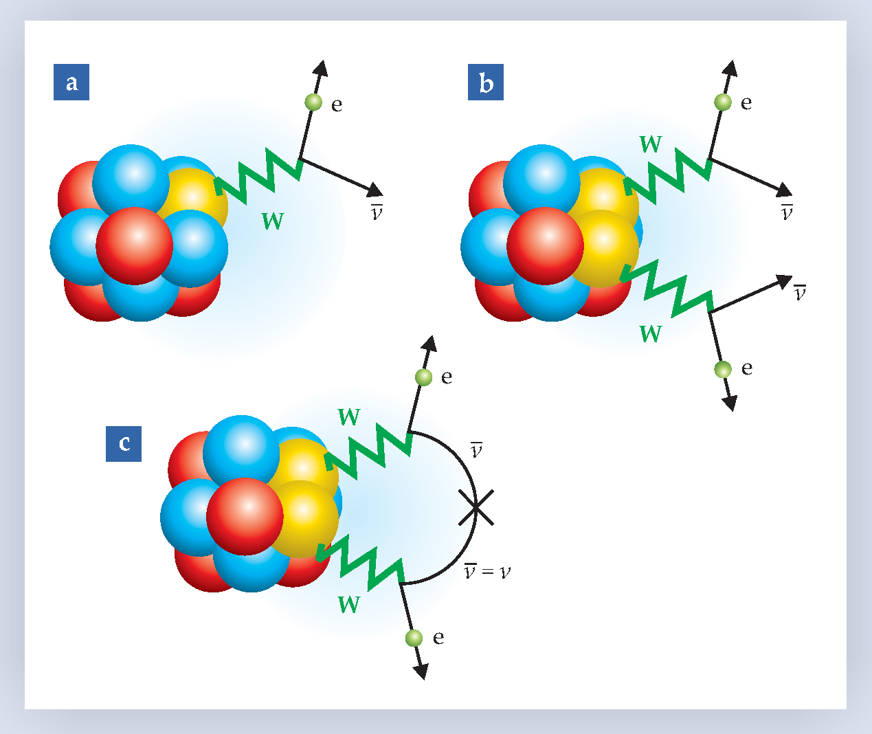 Figure 2. Neutrinoless double beta decay. (a) In conventional beta decay, a neutron decays into a proton (yellow), an electron (e), and an antineutrino (