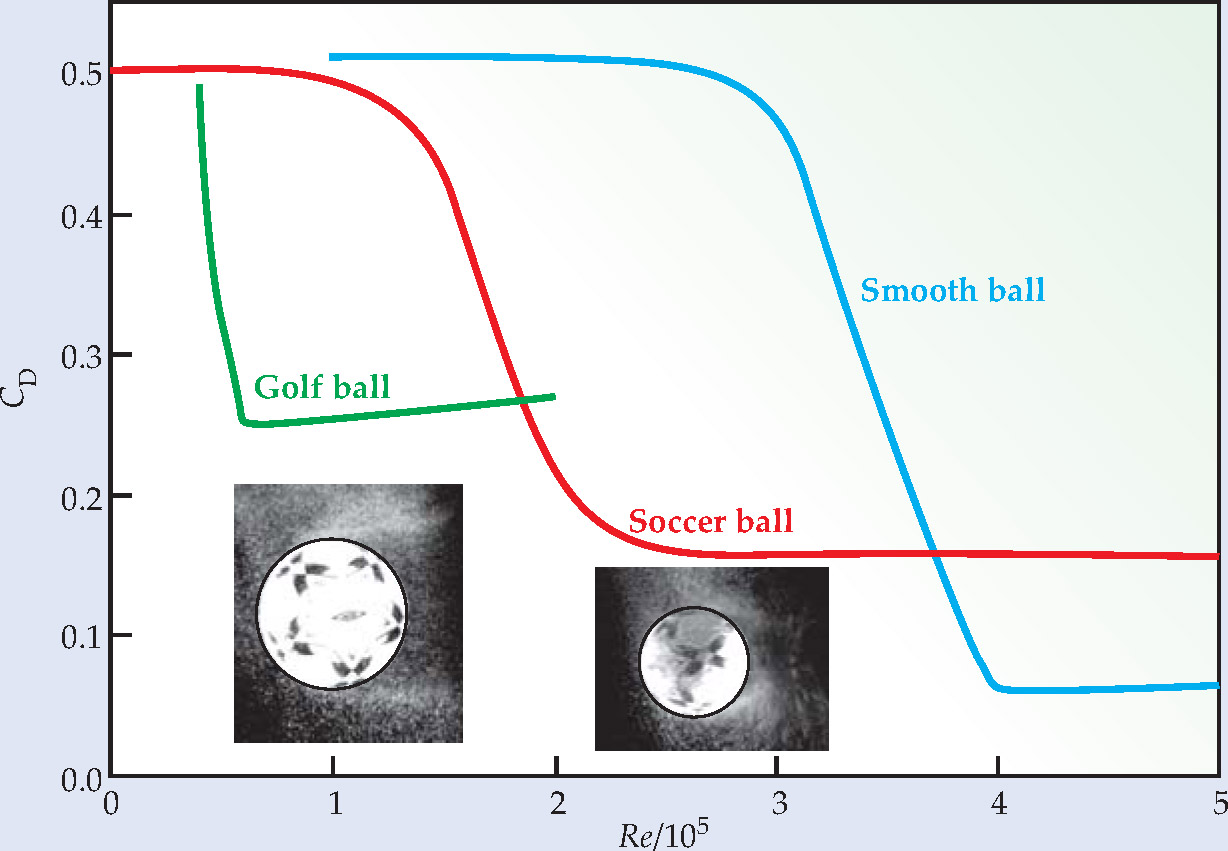 Figure 1 shows C D as a function of Re for three sports balls. Note the precipitous drop in C D, known as the drag crisis, that indicates the transition from laminar to turbulent flow. Surface roughness induces the transition to turbulence at smaller Re. So, for example, a dimple-covered golf ball has its drag crisis at smaller Re than a soccer ball, but the soccer ball’s drag crisis is at a smaller Re than for a smooth ball such as a racquetball; a golf ball without dimples could not travel nearly as far as a normal golf ball. Some experimental data show that beyond the drag crisis, C D rises slightly for soccer balls and more steeply for rougher balls. A baseball has a C D versus Re curve similar to that of a soccer ball for Re up to about 2 × 105; not much data exist for baseballs beyond the drag crisis.