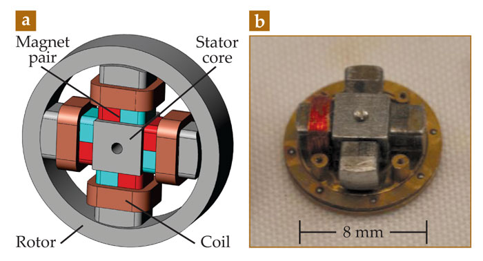 Figure 1. Tiny torquers. Electropermanent magnets power the milli-motein, a prototype form of programmable matter. The miniature motor produces ample torque without dissipating much heat, and it holds its position with the power off. (a) This schematic shows the key elements of the motor. (b) In this photograph, one coil is visible to the left.