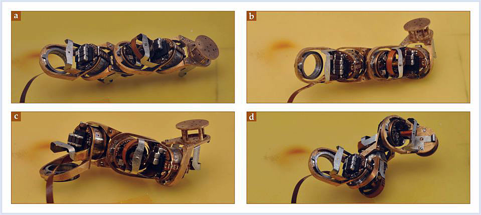 Figure 2. Shape shifting. The milli-motein is a four-segment chain of electropermanent motors, enveloped by a flexible circuit that conveys power and programming instructions; chain segments are separated by 1 cm. The milli-motein can fold itself into several shapes, including (a) a straight line, (b) an L, (c) a periscope, and (d) a helix.
