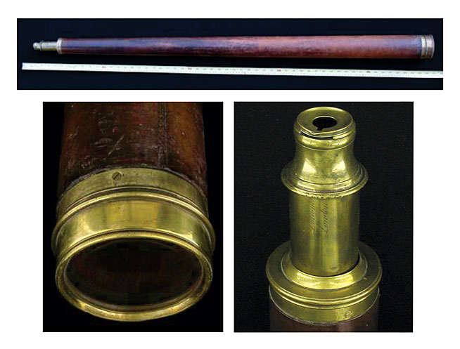 Figure 2. The 140-cm-long Dollond telescope used by Alexandre Koukarine during the 2012 transit of Venus, with close-ups of the lens housing and eyepiece.