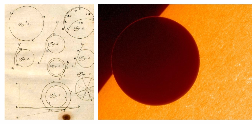 The images here represent two views of the Venusian aureole, a quarter of a millennium apart. The left-hand image shows an illustration plate from Mikhail Lomonosov’s 1761 report announcing the discovery of Venus’s atmosphere. Point A on Lomonosov’s Fig. 1 marks an aureole of light—Lomonosov called it a blister or a bulge—visible around Venus when the planet neared the Sun’s edge at egress. Fig. 2 shows that minor color distortions took place at the edge of the telescope’s field of view; to avoid them, Lomonosov kept Venus (black point labeled “X”) in the center. Figs. 3 through 5 depict the development of the arc in more detail. Lomonosov’s reason for believing the aureole was caused by refraction in Venus’s atmosphere is presented in Figs. 6 and 7.