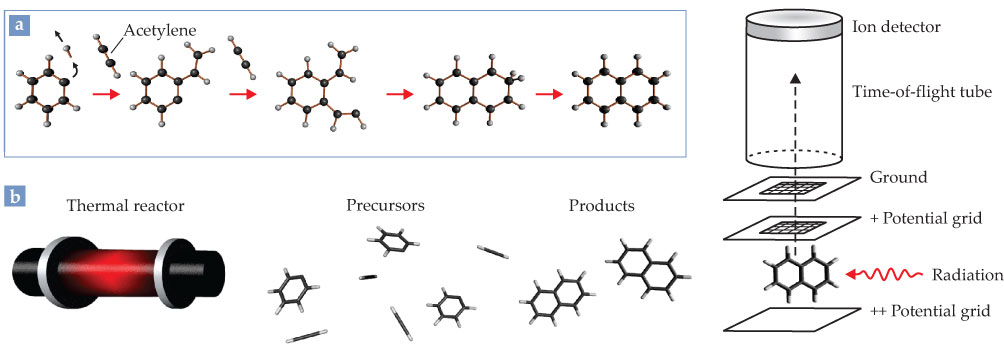 Figure 2. Hydrogen abstraction followed by acetylene addition (HACA). The elemental process in HACA (a) is removal of a hydrogen atom to create a reactive site to which an acetylene molecule can attach. Repetition of the process builds up hydrocarbon rings. (b) As part of an experiment designed to validate the HACA idea, we devised the thermal reactor (in essence, a powerful oven) shown to the left. In the reactor we combined acetylene with one-ringed phenyl radicals at high temperature; according to HACA, those precursors should combine to yield two-ringed naphthalene among its products. To confirm that naphthalene was indeed created, we analyzed the reaction products with synchrotron-radiation-based photoionization mass spectrometry. Our mass spectrometer, shown to the right, was a time-of-flight device, which uses timing measurements to determine the speed of a charged particle accelerated by a known electrostatic potential.