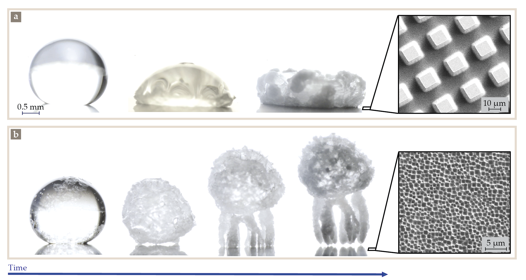 Crystal-critter growth. A drop of salt water evaporates and leaves behind salt crystals. The structure of those crystals is dependent on the texture of the surface. (a) On a microtextured superhydrophobic surface, the gaps between the pillars are large enough for salt crystals to embed themselves in the surface. The overall salt-crystal structure spreads out and clings to the surface. (b) In contrast, a nanotextured surface does not have large enough gaps for the crystals to grow into. Instead, evaporative flux at the 90 °C surface causes crystalline legs to grow such that minerals are ejected from the material. (Adapted from S. A. McBride, H.-L. Girard, K. K. Varanasi, Sci. Adv. 7, eabe6960, 2021.)
