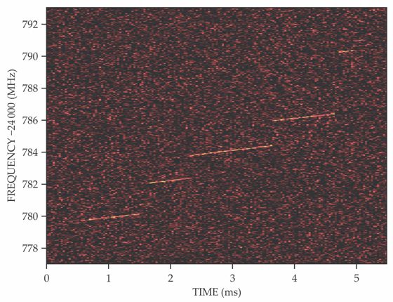 The Project 8 experiment measured the cyclotron radiation emitted by single electrons. This spectrogram shows that as an electron radiates energy away, its emission frequency increases due to relativistic effects. In addition to that gradual increase, Project 8 scientists were able to observe a series of 10-eV jumps due to collisions of electrons with residual gas atoms. Brighter colors indicate more detected power.
