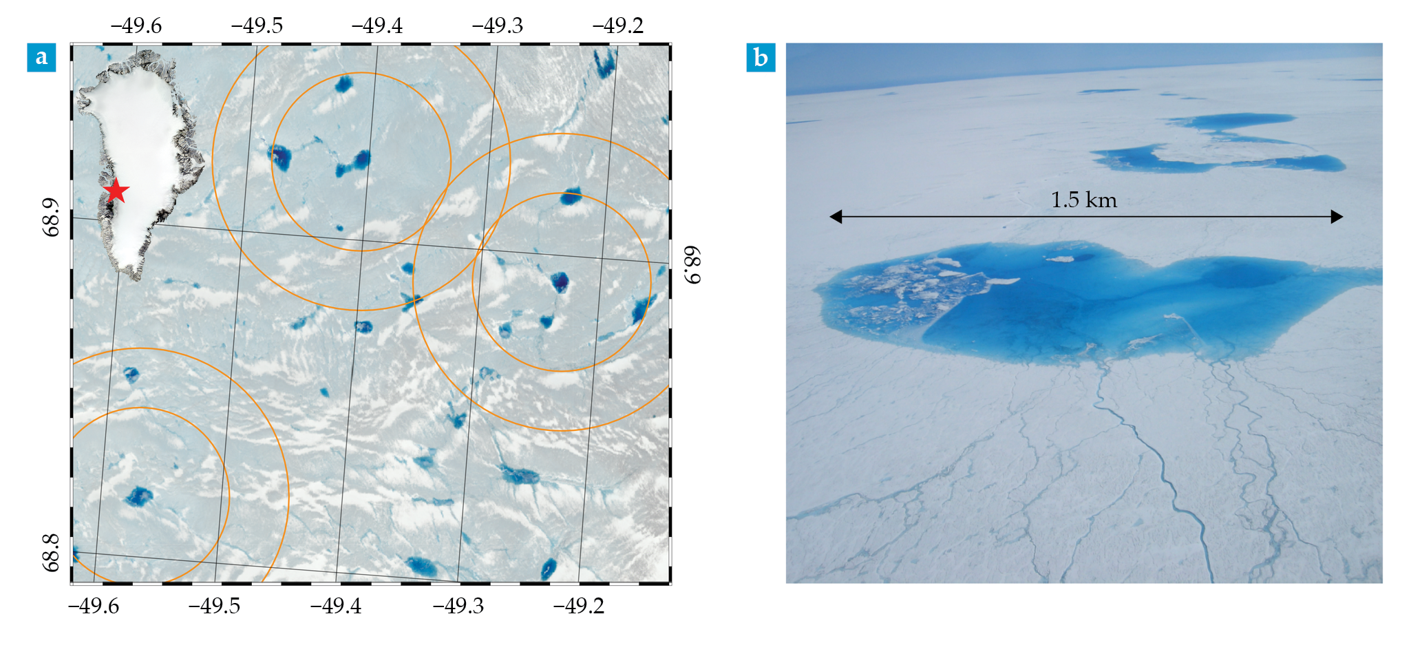 Supraglacial lakes (a) within a 20 × 20 km area (red star in the inset) of the Greenland Ice Sheet are imaged by satellite on 12 June 2018. Orange circles around three of those lakes mark the estimated 3–5 km radius where one lake drainage can induce another. (b) This supraglacial lake is pictured before the water fractures the ice.