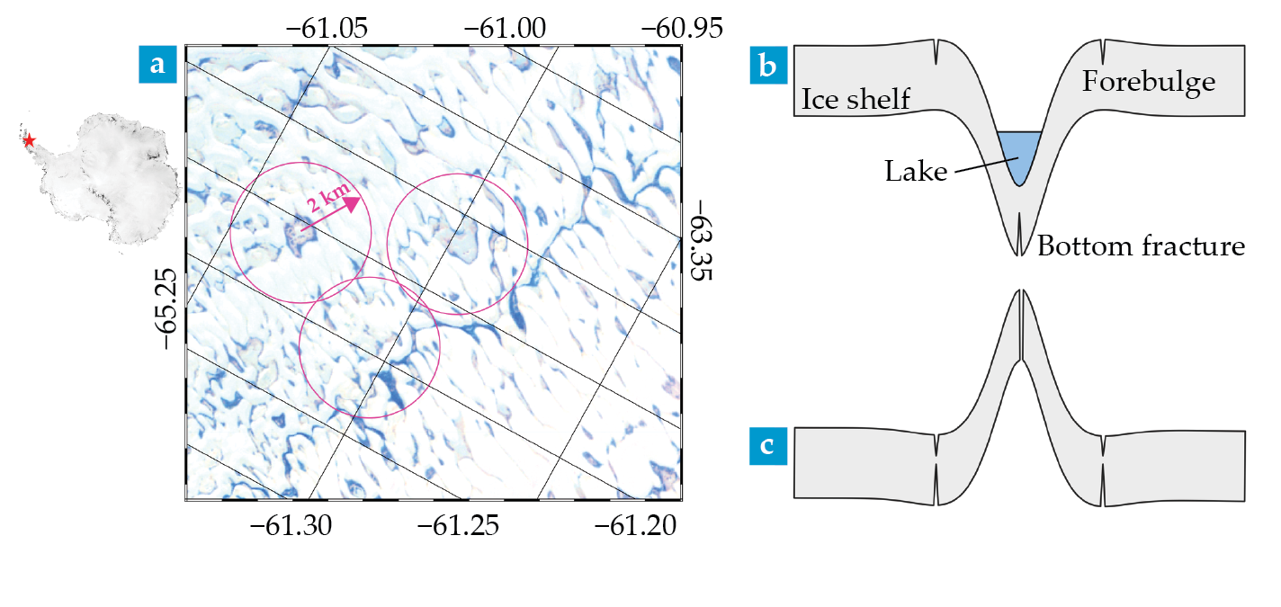 On the Larsen B ice shelf in Antarctica, (a) supraglacial lakes in a 14 × 14 km area are imaged by satellite on 21 February 2000, two years before the ice shelf’s disintegration. Pink circles show the 2 km flexure radius from three lakes. (b) An idealized profile of an ice shelf is pictured before collapse, with a lake and the features it induces: a central basin and a radial forebulge 2 km away and tens of centimeters high. Surfaces in extension are prone to fracture. (c) A profile of the same area is pictured after the lake’s drainage induces isostatic rebound and inverts the forebulge, where new fractures form at the same sites but on the opposite surface.
