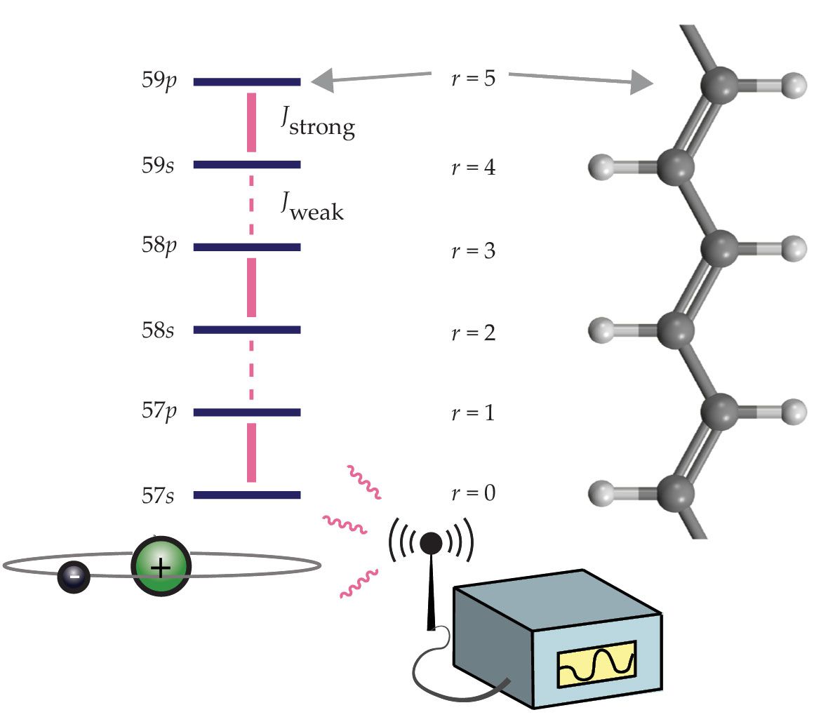 Rydberg atoms as quantum simulators. Highly excited electronic states of strontium-84 atoms (left) that are cooled to nanokelvin temperatures act as position states r, and microwave fields drive transitions between them. States of the Rydberg atoms are connected in a one-dimensional geometry, and a staggered pattern of different tunneling strengths J mimics the lattice structure found in the organic conductor polyacetylene (right). Dynamics in the synthetic dimension are mathematically equivalent to the electron moving between atomic sites in a real molecule.