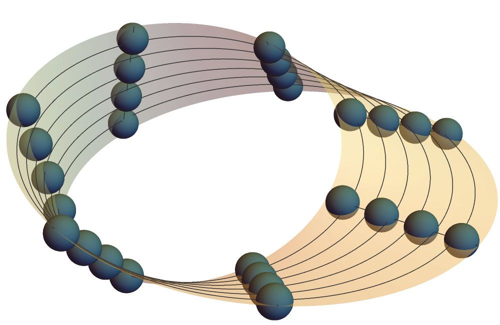 Möbius maneuvers. Synthetic dimensions give experimentalists the tools to reproduce geometries that are difficult or impossible to create in real space. The famous Möbius-strip geometry, for instance, can be created by connecting the Rydberg energy levels (balls) with microwave-driven transitions (lines). The proper geometry emerges when one chooses an appropriate set of Rydberg levels and then drives transitions between them. Along the strip’s width are transitions that change the angular momentum ℓ but keep the principal quantum number n fixed; and along its circumference are transitions that change both ℓ and n.