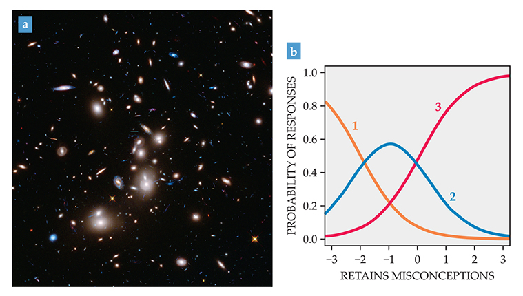A persistent misconception among astronomy students is that galaxies are randomly distributed. (a) This Hubble Deep Field image shows that galaxies are clustered together, not randomly located. (Courtesy of NASA/ESA/STScI.) (b) The probabilities shown here specify the likelihood of responding with a low (1), medium (2), or high (3) degree of misconception retainment, as predicted by item response theory, based on responses to the statement “The galaxies are randomly distributed.” The axis labeled “Retains misconceptions” describes the overall tendency for a student to hold on to misconceptions. The overwhelmingly high probability of responding with a 2 or 3 indicates that even those students who do not strongly retain misconceptions are likely to believe that galaxies are randomly distributed—even after instruction.