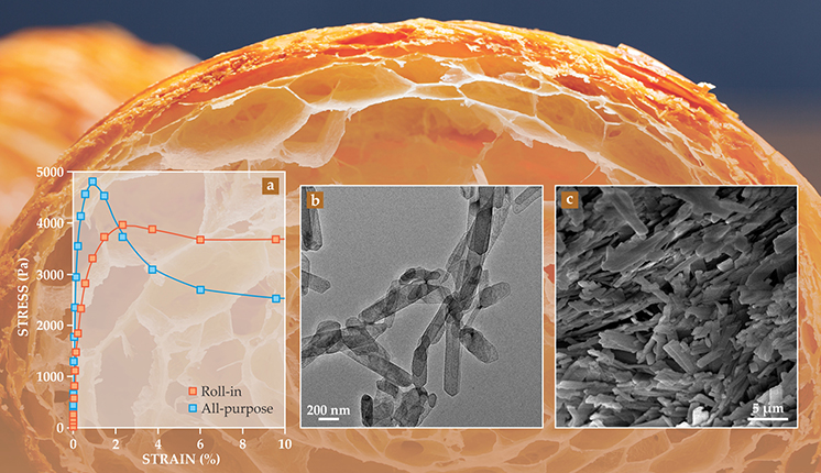 As panel a shows, for very small strain, the stress of both roll-in and all-purpose fat responds linearly. The fats act like viscoelastic solids and deform reversibly; in fact, that solid-like response is observed across the frequency spectrum. The linear regime is very narrow and terminates at a critical strain on the order of 0.01%, a value typical of materials acting via short-range or van der Waals interactions. Strains beyond the critical value are sufficient to disrupt the network and initiate irreversible yielding behavior. During the lamination process, a roll-in fat must withstand pressures that are easily sufficient to drive the material to the nonlinear regime.