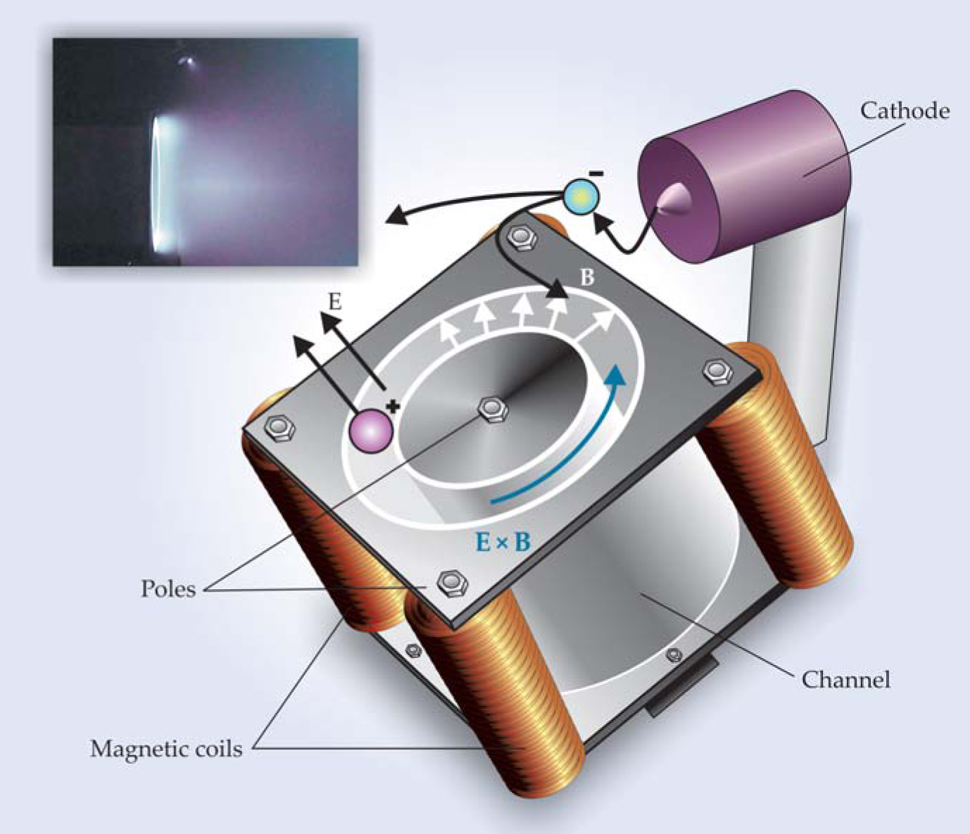 In the typical Hall effect thruster (HET) sketched here, a portion of the electrons emitted from a cathode migrate into a coaxial channel with a ceramic lining. The anode (not shown) is at the base of the channel. The electrons become trapped by a strong radially directed magnetic field B and drift in the azimuthal (E × B) direction, perpendicular to both the electric (E) and magnetic fields; positive ions escape from the channel and impart thrust. The inset shows a Hall thruster in ground testing. Note the glowing plasma at the mouth of the coaxial channel and, as a small white dot, at the cathode. The nature of the plume to the right of the mouth is a subject of current research.