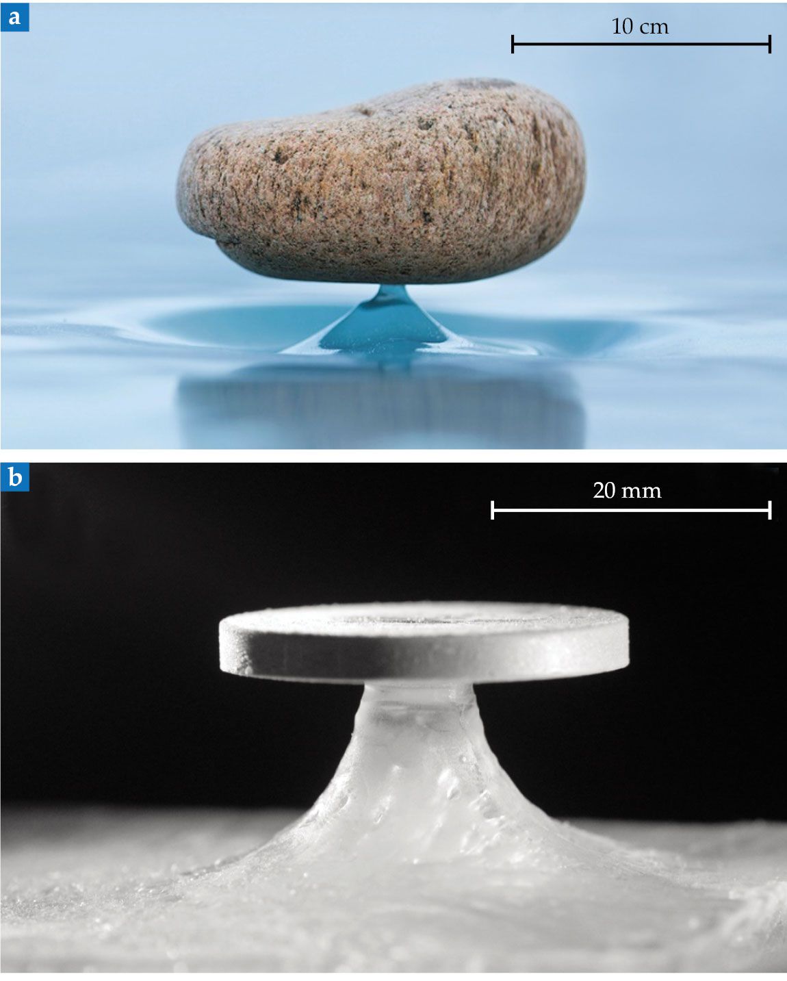 Zen stones in nature and the lab. (a) On Lake Baikal a stone rests on a narrow ice pedestal. (b) In a laboratory, this 30 mm aluminum disk rests on a flat ice surface after sitting in a lyophilizer for 40 hours. (Adapted from Proc. Natl. Acad. Sci. USA 118, e2109107118, 2021, doi:10.1073/pnas.2109107118