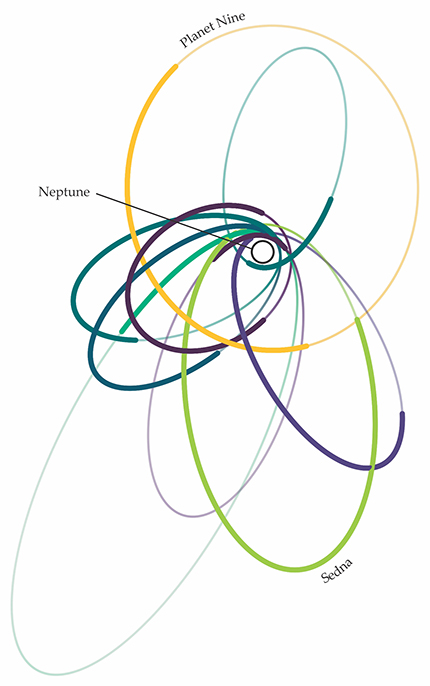 At the time of Sedna’s discovery, Chadwick Trujillo (then at the Gemini Observatory), David Rabinowitz (Yale University), and I suggested that Sedna’s orbit was likely modified by a passing star early in the history of the solar system, when the Sun would still have been part of the cluster of stars in which it was born. The close proximity of potentially thousands of stars could have given Sedna enough of a nudge to move its orbit away from that of Neptune. When the cluster of stars dispersed, Sedna would have been left as a fossil record of the distant past. But in 2012 Brazilian astronomer Rodney Gomes pointed out that Sedna and others like it could instead be the natural consequence of a distant massive planet.
