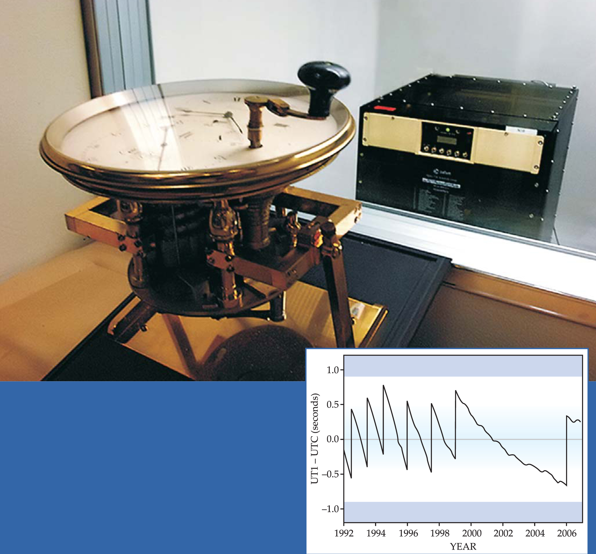 Precision clocks, such as the black hydrogen maser atomic clock on the right in current use and the older display companion shown here, measure a time independent from that defined by Earth’s rotation. The graph shows the steady drift between one atomic clock time scale, coordinated universal time, and the Earth-rotation-based scale UT1. The seven spikes show the leap-second adjustments made to UTC since 1992 to ensure that the two standards don’t drift too far apart. The international agreement that established those adjustments is currently being reconsidered; the leap second may soon be a thing of the past.