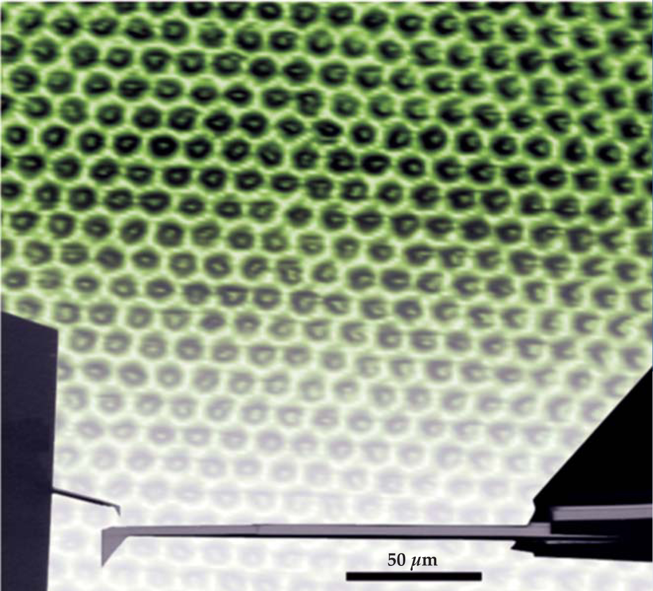 Cantilevers and carbon. A relatively large cantilever such as the one that dominates the foreground is the key component of an atomic force microscope, which is capable of achieving atomic-scale resolution. Indeed, the background photograph is an AFM image of the graphite lattice. To the left in the foreground is an ultralow-mass cantilever about 1/10 the size of those usually used in AFMs. Its high resonance frequency—9 MHz as compared with the 300 kHz of the conventional cantilever—allows for faster imaging and reduces the impact of thermal noise.