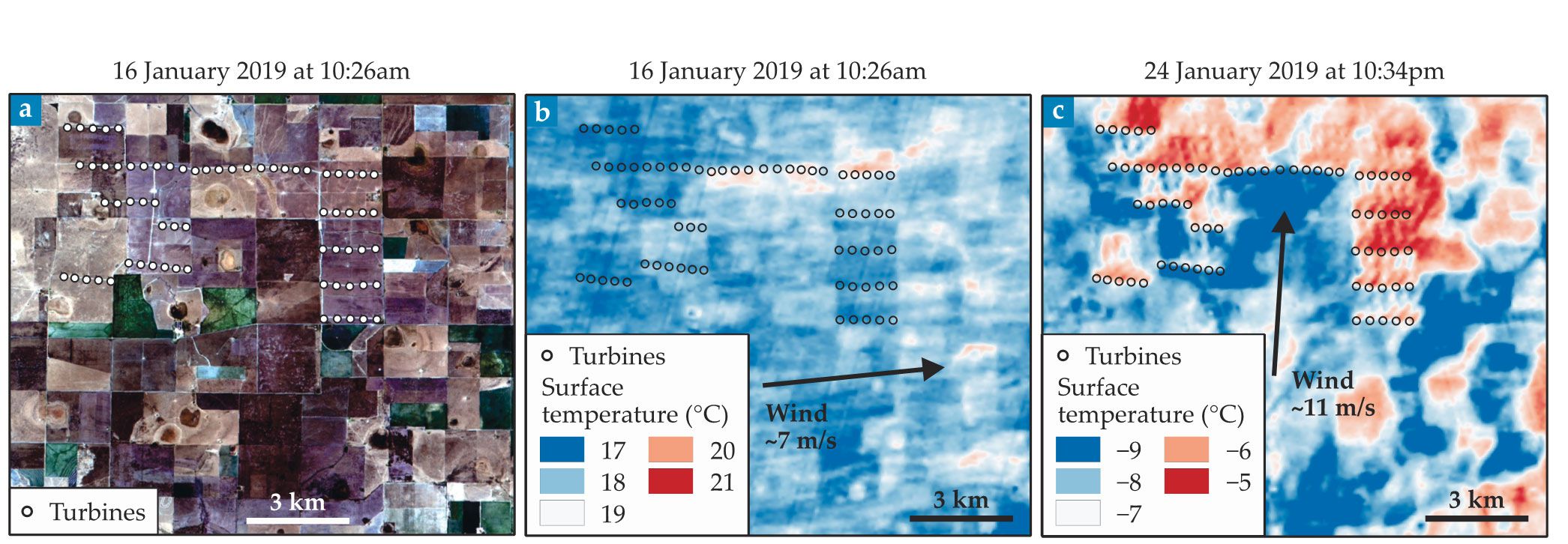 The recent release of several free public data sets now makes assessing wind power’s surface warming relatively straightforward. The US Geological Survey maintains the US Wind Turbine Database, which includes geospatial data and technical specifications on about 60 000 operational US wind turbines. Data from NASA’s Landsat 8 satellite is also free and publicly available. Although primarily used for monitoring vegetation, Landsat 8 also measures ground surface temperatures—or, more specifically, emissivity in the IR—at a spatial resolution of 8100 square meters.