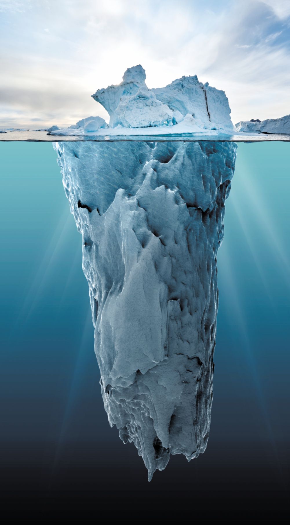 The phrase “tip of the iceberg” suggests that what you see is much less than what is hidden from view. The concept of a tip above seawater and a much larger root below more or less conforms to Archimedes’s principle of buoyancy: The force exerted on a body partially or completely immersed in a fluid of higher density is directed upward and is equal to the weight of the fluid that the body displaces.