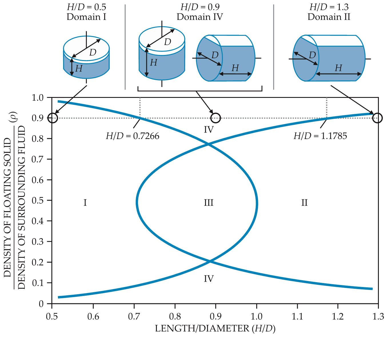 In 2004 D. S. Dugdale presented a useful discussion of the floating-cylinder problem. He defined four domains of stable equilibrium in density–shape space: (I) The cylinder floats with its rotational axis perpendicular to the water surface and its circular faces parallel to the water surface. (II) The cylinder floats with its rotational axis parallel to the water surface and its circular faces partially submerged to a depth dependent on the density of the cylinder. (III) The rotational axis of the cylinder is tilted at an angle neither parallel nor perpendicular to the surface. (IV) The orientations described in I and II are both stable.