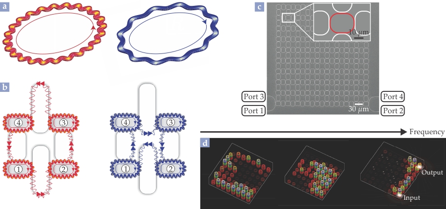 Figure 2. Topological physics with resonators. (a) A charged particle in a magnetic field satisfies a different quantization condition—the integer number of 2π phase wiggles in its wavefunction—when circulating counterclockwise (red) versus clockwise (blue). That difference is proportional to the magnetic flux threading the loop. (b) One can engineer a different number of wiggles for clockwise and counterclockwise circulation through an array of optical resonators. The illustration here shows a plaquette of four optical resonators coupled by waveguides. For the counterclockwise (red) path, light traveling from resonator 3 to resonator 4 travels a greater distance than light traveling along the clockwise (blue) path from 4 to 3. That length imbalance means that the phase picked up by photons is different for counterclockwise versus clockwise propagation. (c) Shown here is an electron micrograph of an array of optical resonators with waveguides, fabricated with silicon-on-insulator technology. Light enters and exits via waveguide ports on the bottom left and right of the device. In the inset the resonator is red and surrounding waveguides are white. (d) Depending on the frequency of light entering the array, light can take the long way around from input to output ports (left), be trapped in the bulk (center), or travel on just a single edge (right).