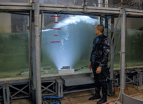 Figure 1. The breaking laboratory wave seen here is moving from right to left and is lit from beneath. We analyzed turbulent, air-entraining flow in white, foamy wave regions like that shown just below the water surface. Electrical engineer James Uyloan helps show the scale of the experiment.
