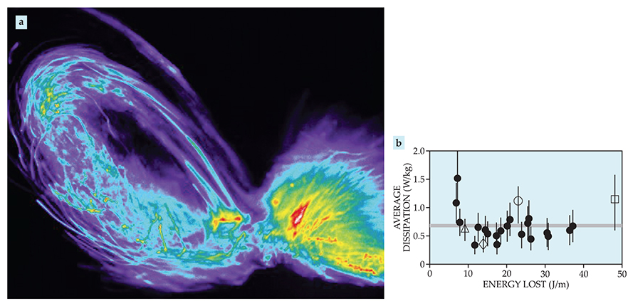 Figure 2. Bioluminescence in response to shear stress is one tool we use to measure turbulent dissipation. (a) Flash-rate images such as this one obtained with dinoflagellates enable quantitative maps of the time-varying fluid shear stress in a breaking wave. (In this false-color image, warm colors indicate more intense bioluminescence.) The wave generating the pattern moved from left to right. (b) Experiments on four waves contributed to this plot, in which the average rate of turbulent energy-density dissipation in waves is shown as a function of the total energy lost, normalized by the width of the wave tank. Filled circles indicate results obtained via wave-height or bubble-distribution measurements. Open symbols indicate results obtained from bioluminescence; each open symbol represents its own wave. The total energy lost in the four waves differs from trial to trial, but the average dissipation rate does not, a phenomenon we call turbulence saturation.