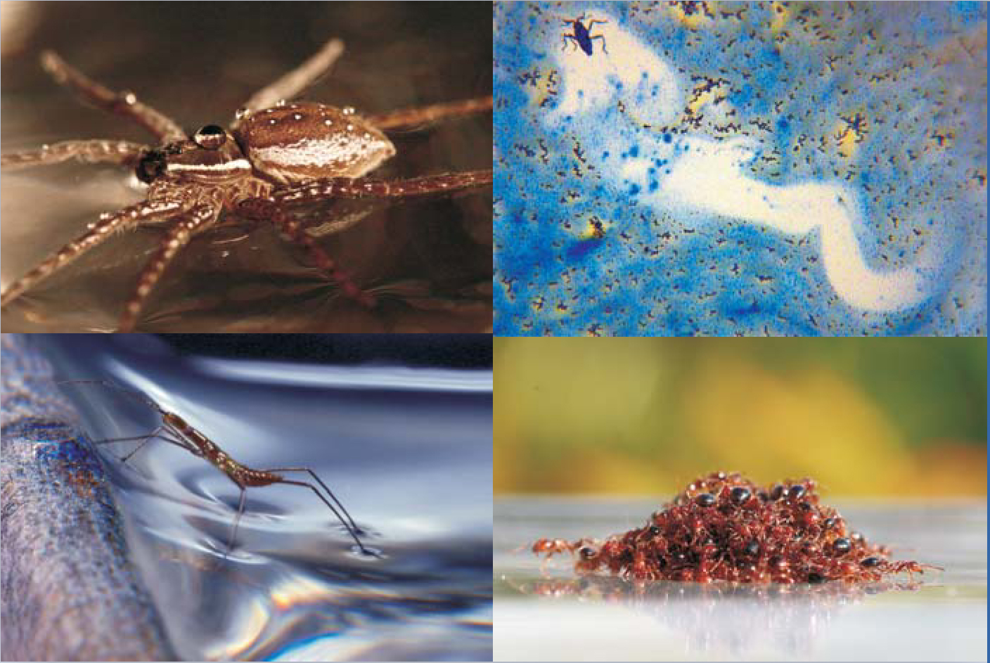 Figure 1. Microphysics enables water walking. (a) Surface tension serves as a trampoline that supports the weight of small water walkers, such as this fisher spider. Note the beaded drops on the spider’s water-repellent coat. (b) By releasing a lipid, this Microvelia generates a surface-tension difference that propels it forward. (c) Some insects, like this Hydrometra, can climb a meniscus by clasping it with the hydrophilic claws on its front and hind legs. (d) During times of flood, fire ants assemble into a floating, water-repellent raft.