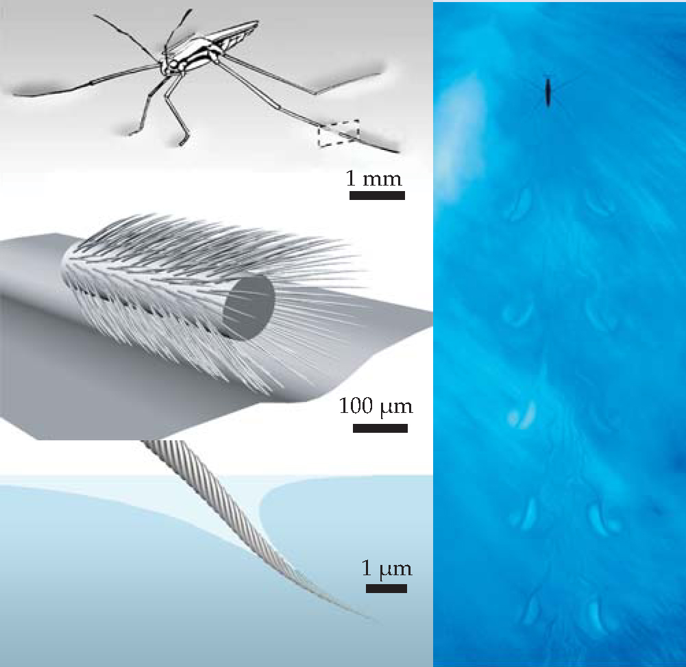 The water strider is one of the most common and highly adapted water-walking insects. To generate a propulsive force, it strikes the surface with its middle pair of legs in a sculling motion. Flexible grooved hairs on the driving legs point toward the leg tips (figure