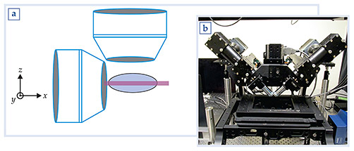 Figure 1. Light-sheet fluorescence microscopy is a fast and gentle technique that produces high-quality three-dimensional images. (a) A sample is illuminated with a sheet of light that can be created, for example, by passing a laser beam through a cylindrical lens or by scanning a rightward moving laser beam in the y direction. Mirrors and lenses to the left of the illuminating objective lens shift the light sheet in the z direction to enable 3D imaging. The fluorescence emitted by the sample passes through the objective lens above the specimen to a wide-field camera. (b) A modern light-sheet fluorescence microscope is shown.