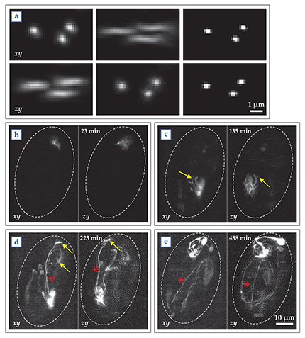 Figure 2. Dual-view inverted selective-plane illumination microscopy (diSPIM) in action. (a) In the left panel, beads are illuminated and recorded as in figure 1a; note the much better resolution in the xy-plane. In the middle panel, the roles of the two lenses in figure 1a are reversed, and the resolution is better in the zy-plane. A mathematical “joint deconvolution” of the two views gives good resolution in all three dimensions (right panel). (b–e) In these snapshots of Caenorhabditis elegans embryogenesis as viewed in diSPIM, yellow arrows point to growth cones—budding axons and dendrites—and red asterisks indicate growing axons.
