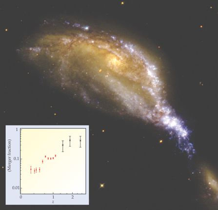 Galaxy mergers were more common in the early universe than they are now. The plot shows the fraction of galaxies with stellar masses greater than 1010 solar masses that are in the process of merging, as a function of redshift z, a measure of cosmic time. The present day corresponds to a redshift of 0; the halfway point of cosmic history corresponds to a redshift of about 1. Data are from the Hubble Space Telescope COSMOS field (red) and Ultra Deep Field (black) surveys. The background image (courtesy of NASA) shows the aftermath of a collision of a large, spiral galaxy with a smaller galaxy to the lower right, nearly out of the field of view. The blue-white area is a region of star formation triggered by the collision.