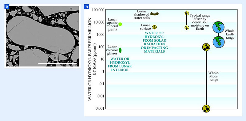 Observations of lunar water. (a) This photomicrograph shows volcanic glass beads obtained from lunar soils collected by the Apollo 15 astronauts. The beads contain as much as 46 parts per million by mass of water and provide evidence that the Moon accreted with at least some water. The scale bar is 100 µm across. (b) Water has also been observed on the lunar surface and in craters. This chart indicates high-end estimates for the water or hydroxyl content of various lunar materials and compares them to lunar and terrestrial benchmarks.