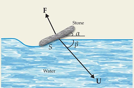 Figure 1. Before skipping off a water surface, a disk-shaped stone creates an air-filled cavity. A hydrodynamic pressure force F normal to the stone’s broad surfaces then jettisons the stone. This illustration defines the geometric parameters that determine F. The attack angle α is defined by the orientation of the stone, the course angle β is determined by the stone’s impact velocity U, and S denotes the area of the stone wetted by contact with water.