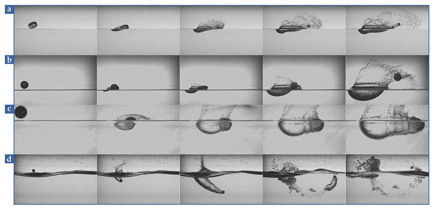First-time users of water-skipping balls often find the toys’ behavior counterintuitive, particularly since the balls bounce poorly on hard surfaces. On the other hand, racquetballs and other spheres that have a large restitution coefficient and bounce well on land do not skip well on water. Figure 2c shows why. The modulus of elasticity of a racquetball is about 5–10 times that of a typical elastic water-skipping toy ball—in other words, the racquetball is much stiffer than the compliant toy. It therefore deforms less under the same hydrodynamic impact loading and experiences a smaller lift force.