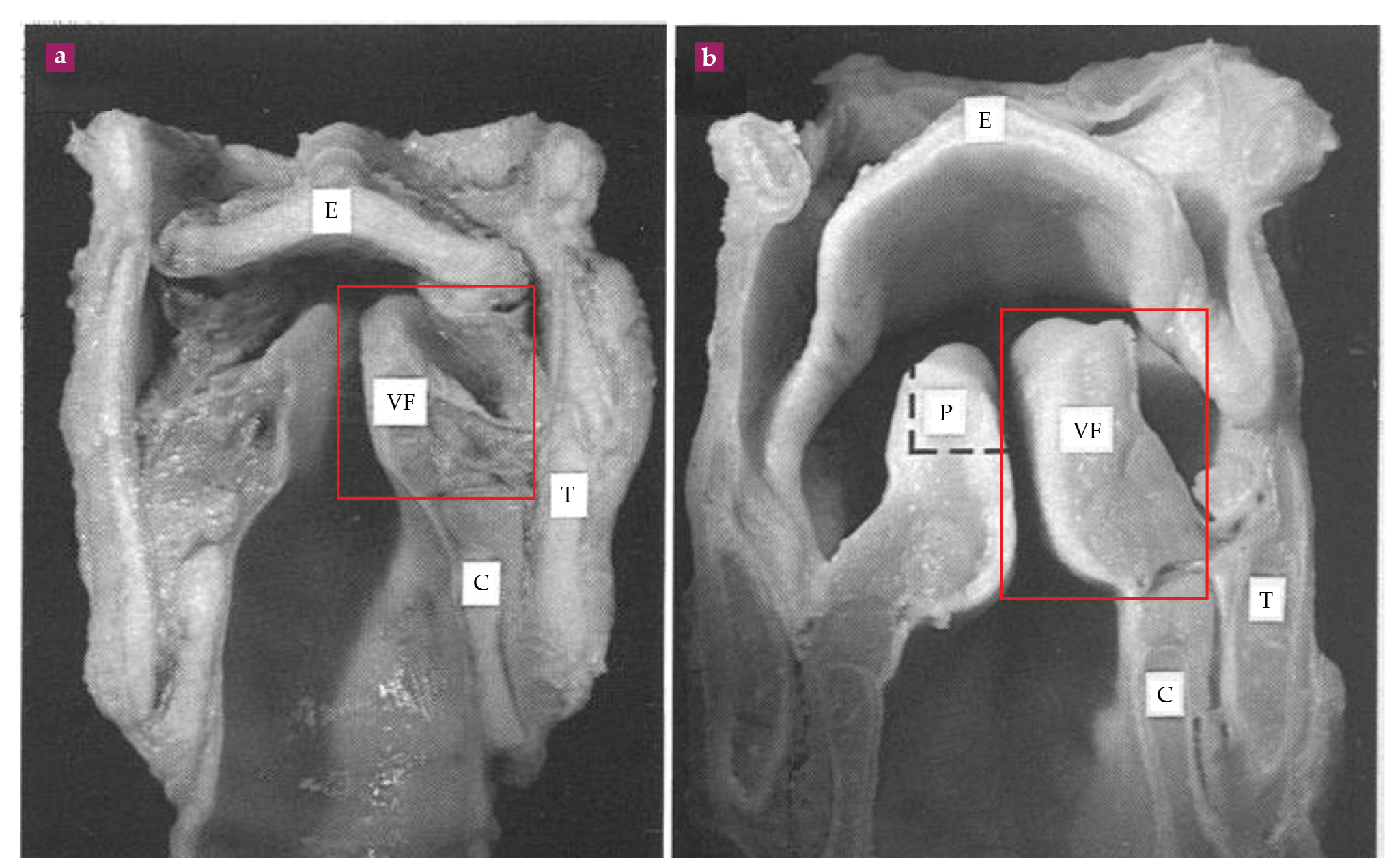Big-cat voice boxes. The voice box of (a) the nonroaring snow leopard has triangular-shaped vocal folds (VF), while that of (b) the roaring jaguar, along with other roaring big cats, has large rectangular-shaped vocal folds. Also pictured are the epiglottis (E), thyroid cartilage (T), cricoid cartilage (C), and pad (P) of fibroelastic tissue. (Adapted from M. H. Hast, J. Anat. 163, 117, 1989.)
