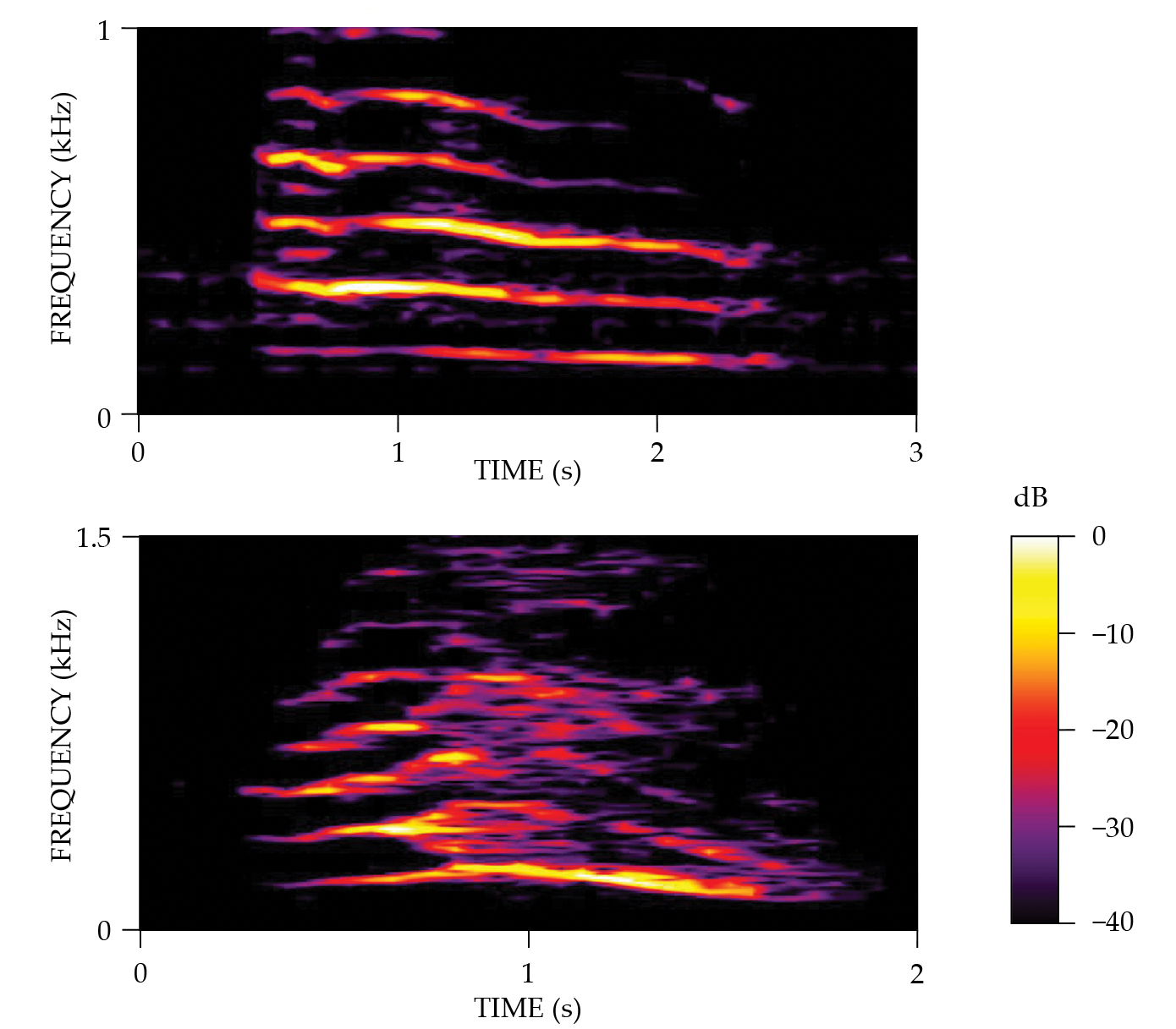 Two examples of spectrograms of a tiger’s long-distance advertisement call, which illustrate the harmonic nature of the roar and its aperiodic components.