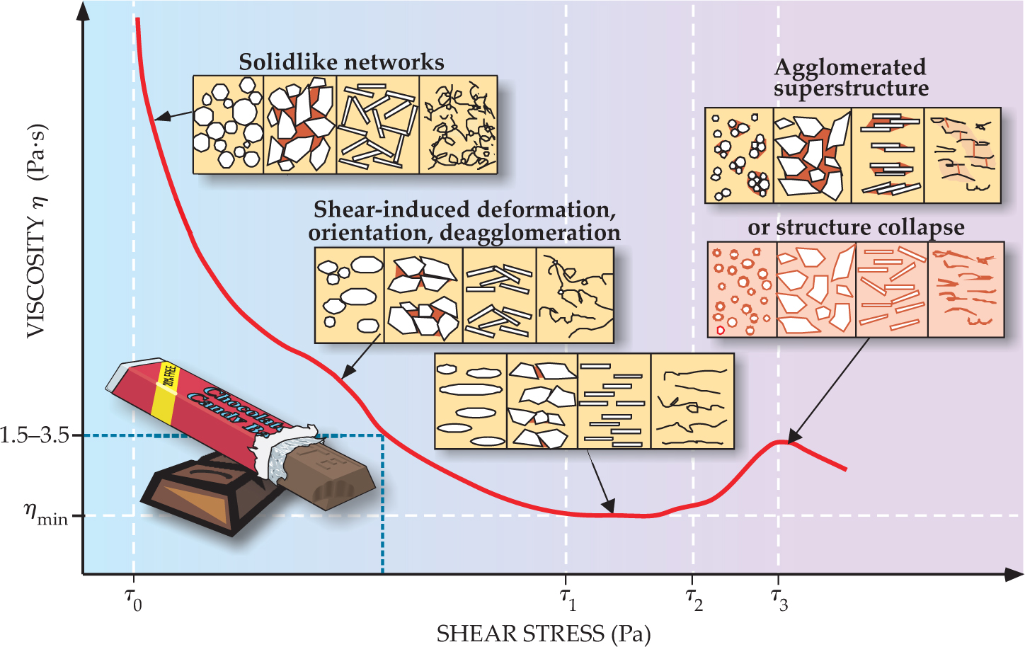 The structuring effects are triggered when the shear stress exceeds a characteristic value τ0, called the yield value. Typically, τ0 is in the range of 5–12 Pa. Once the yield value is surpassed, melted chocolate ceases to behave like a solid. With increasing shear stress, the structuring effects get further developed, and as a consequence, the viscosity decreases. At fixed shear stress, developing structure would also lead to a decrease in viscosity with time, until a shear-stress-specific equilibrium structure is reached. At a second characteristic shear stress τ1, the viscosity reaches its minimum value ηmin, which is typically about 0.5–2.0 Pa·s; the structuring is said to be “completed.” As the shear stress increases beyond τ1, the viscosity remains constant until a new characteristic stress τ2 is reached. Once τ2 is exceeded, shear-induced structure collapse or “superstructuring” may occur; one type of superstructure consists of agglomerated flocculated particles. As a consequence of those structural changes, the viscosity increases with shear stress or shear rate and with time. As yet another stress τ3 is surpassed, any superstructure degrades, and viscosity once again falls with increased stress, shear rate, and time. If structure collapse or superstructuring doesn’t occur, the high-shear viscosity keeps the value ηmin.