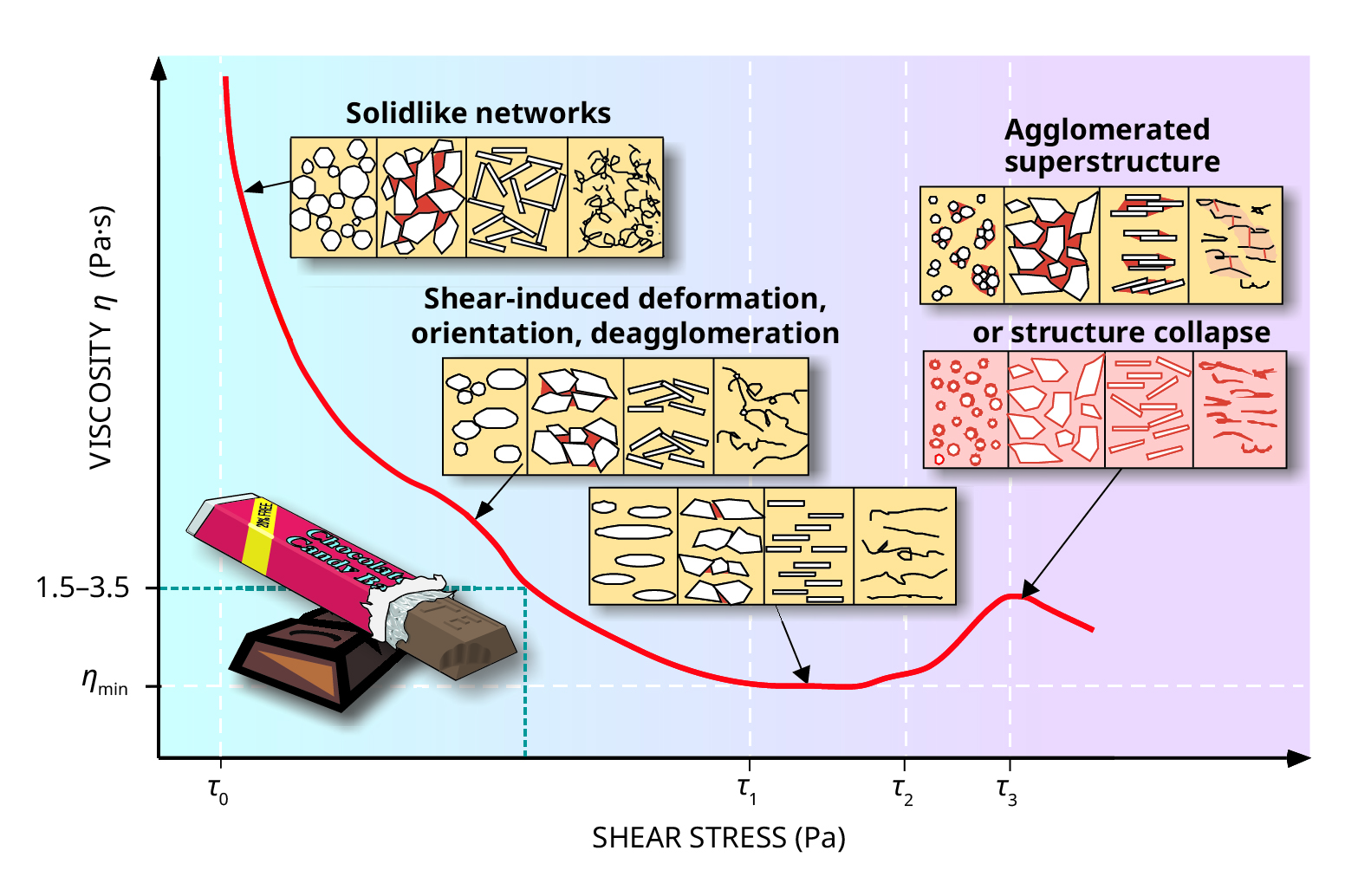 The structuring effects are triggered when the shear stress exceeds a characteristic value τ0, called the yield value. Typically, τ0 is in the range of 5–12 Pa. Once the yield value is surpassed, melted chocolate ceases to behave like a solid. With increasing shear stress, the structuring effects get further developed, and as a consequence, the viscosity decreases. At fixed shear stress, developing structure would also lead to a decrease in viscosity with time, until a shear-stress-specific equilibrium structure is reached. At a second characteristic shear stress τ1, the viscosity reaches its minimum value ηmin, which is typically about 0.5–2.0 Pa·s; the structuring is said to be “completed.” As the shear stress increases beyond τ1, the viscosity remains constant until a new characteristic stress τ2 is reached. Once τ2 is exceeded, shear-induced structure collapse or “superstructuring” may occur; one type of superstructure consists of agglomerated flocculated particles. As a consequence of those structural changes, the viscosity increases with shear stress or shear rate and with time. As yet another stress τ3 is surpassed, any superstructure degrades, and viscosity once again falls with increased stress, shear rate, and time. If structure collapse or superstructuring doesn’t occur, the high-shear viscosity keeps the value ηmin.