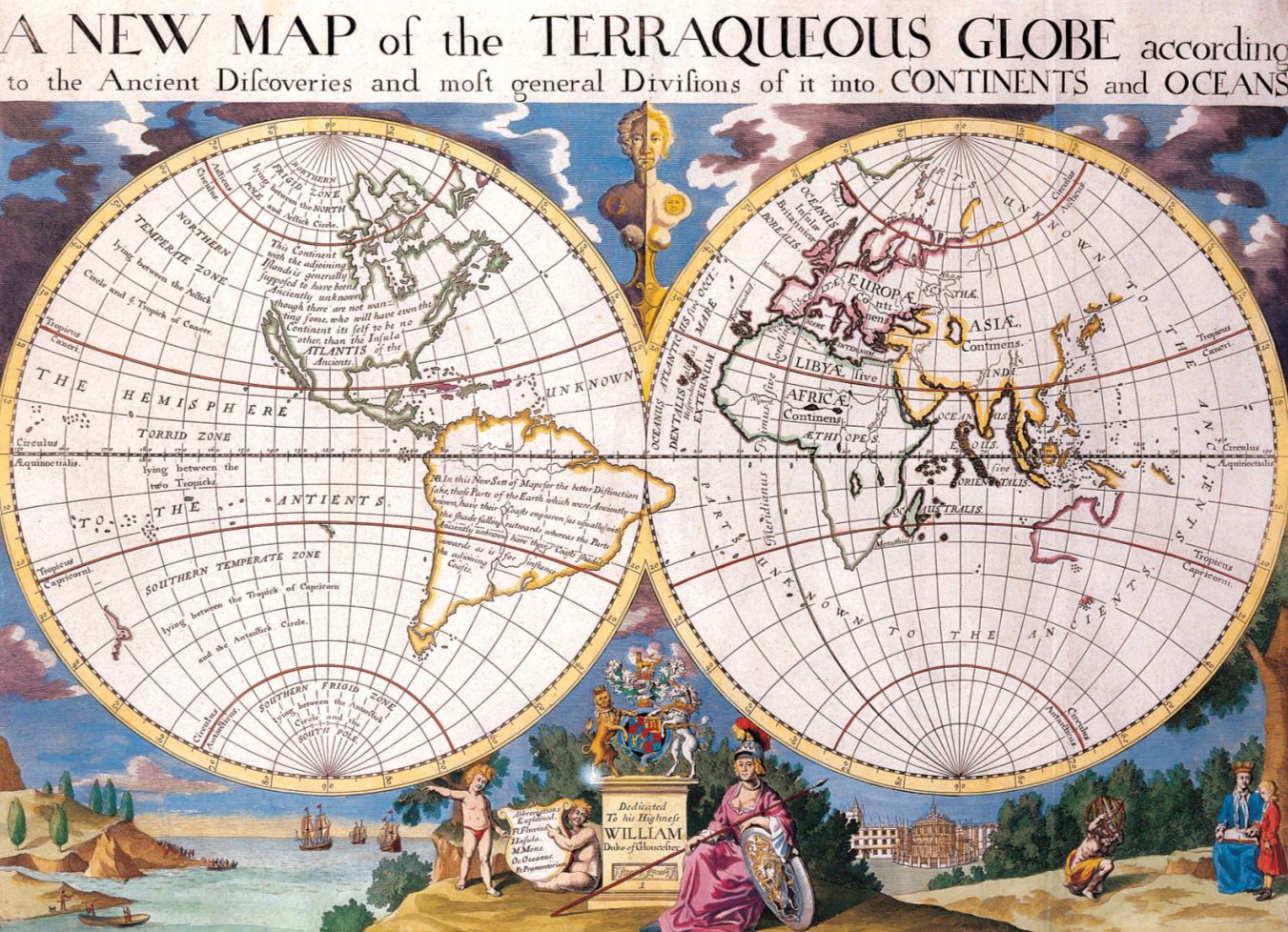 A world map drawn by English mathematician Edward Wells circa 1700.