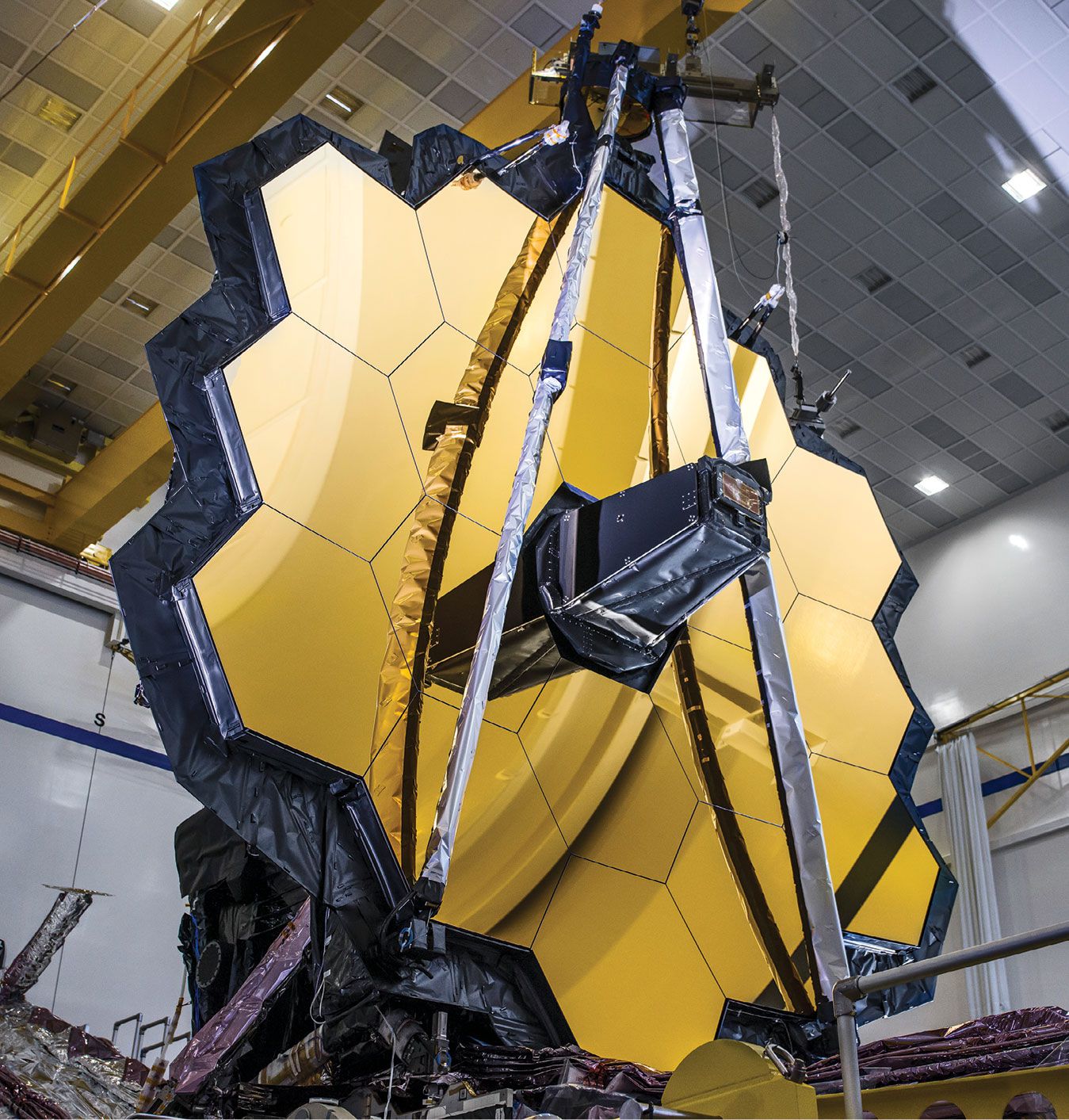 The 6.5-meter primary mirror of the James Webb Space Telescope deployed during a 2020 test at NASA’s Goddard Space Flight Center in Greenbelt, Maryland.