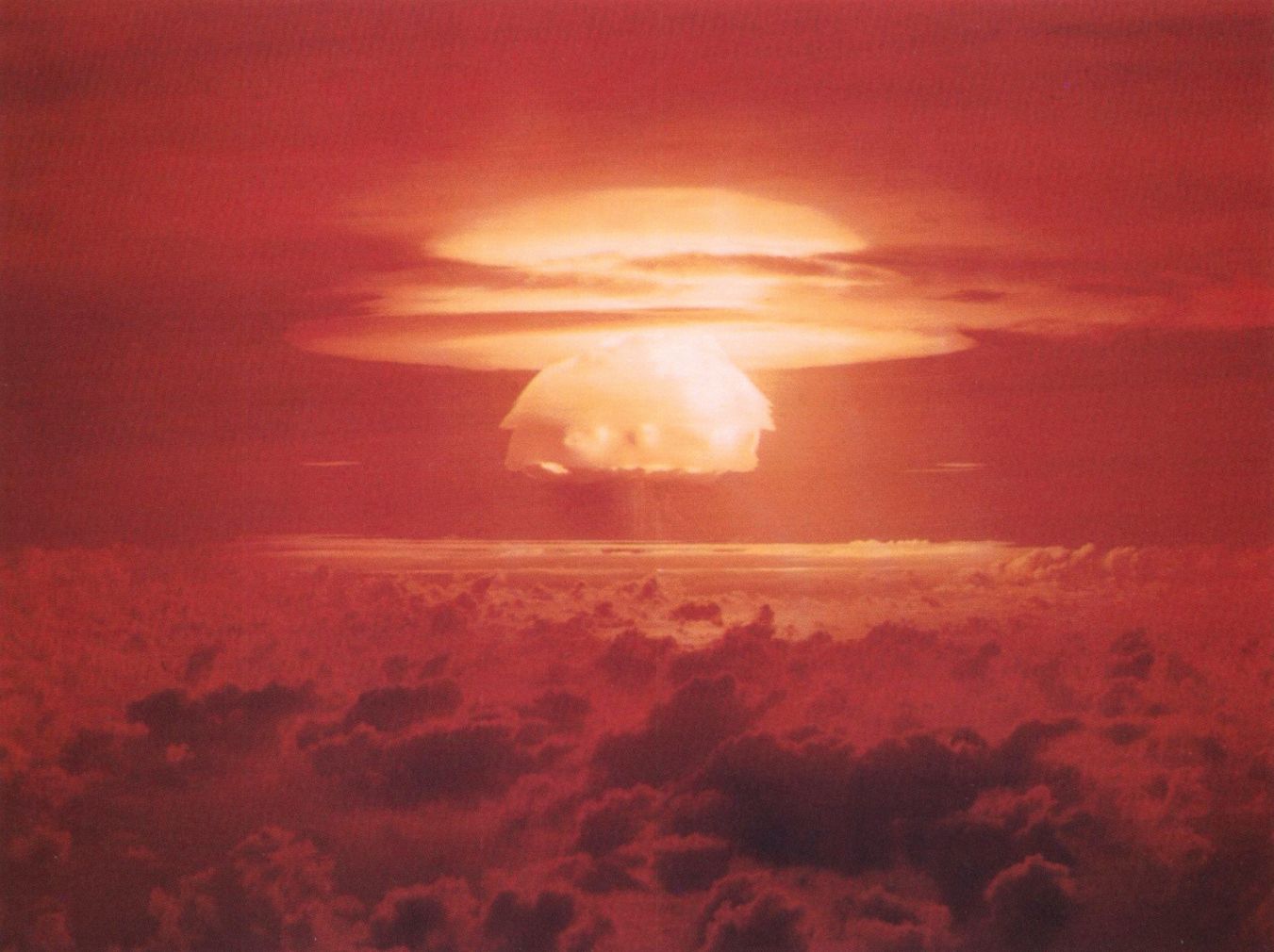 The mushroom cloud from the Castle Bravo thermonuclear test on 1 March 1954 at Bikini, an atoll in the Marshall Islands. Fallout from the explosion rained down on the Japanese fishing vessel Lucky Dragon No. 5 and caused radiation sickness among its 23 crew members.