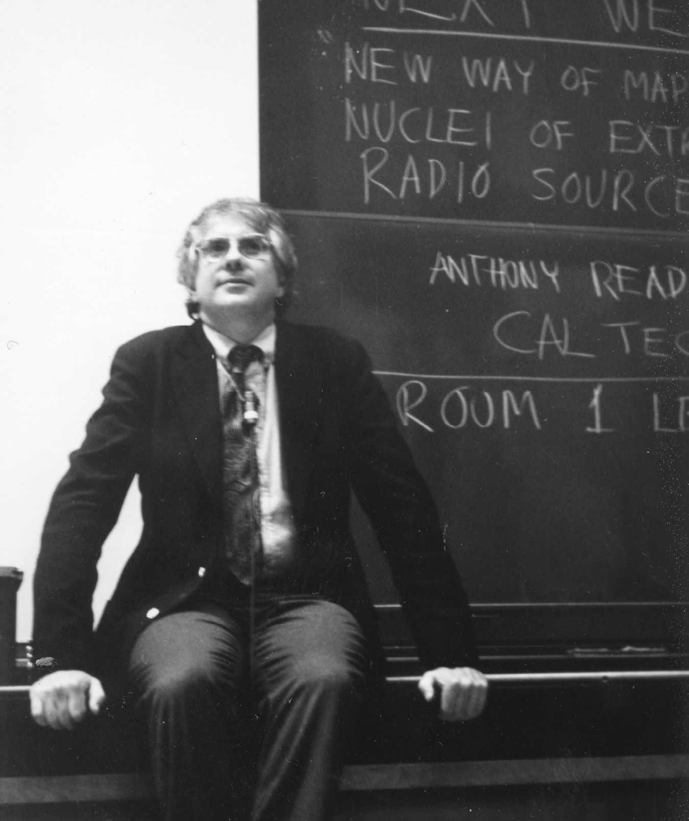 The quantum field theorist Sheldon Glashow lecturing while sitting on top of a desk.